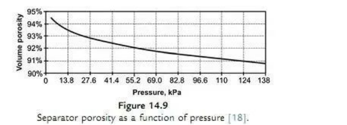 FIG. 14.9 shows the pore ratio of a 225g/m2 AGM sample as a function of applied pressure (not exceeding 138kPa). The porosity was expressed as the proportion (percentage) between the volume of micropores and the total volume of AGM separator[18].